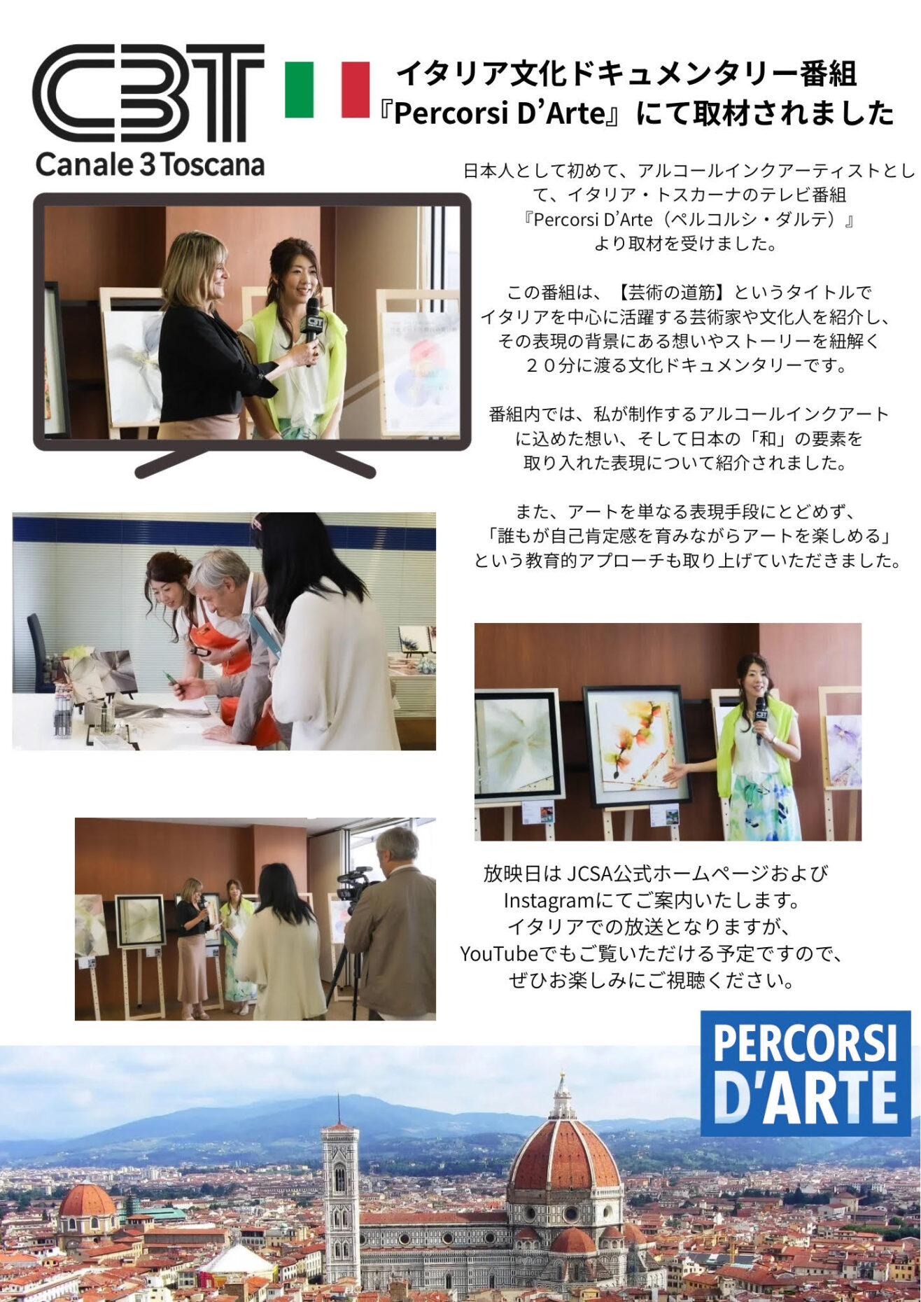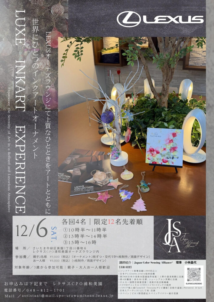 “アート”で変わる。“成功”か”大成功”しかない道へ。 JCSA - Japan Color Sensing⁺ Alliance®JCSAでは、’色’Color の力により、個々の”センスSensing”を引き出します。 JCSAについて 講師募集を見る “アート”で変わる。“成功”か”大成功”しかない道へ。 JCSA - Japan Color Sensing⁺ Alliance®JCSAでは、’色’Color の力により、個々の”センスSensing”を引き出します。 JCSAについて 講師募集を見る LEXUS様JCSA共同イベント全回満席御礼にて無事に終了しました。____________イタリアTV番組出演【こちらクリックYouTubeにて】アルコールインクアート 色に導かれて〜芸術の旅〜 イタリア文化ドキュメンタリー番組 『Percorsi D’Arte(ペルコルシ・ダルテ)』 に出演しました! ____________ 現在お申込みいただけるJCSAアートクラスうらわ美術館出展クラスになります。 □1月18日(日)ギャラクシーアート15:30浦和第三クラス □2月22日(日)レインボーアート15:00浦和第三クラス What’s New JCSA公式クラスお申込みはこちら お申し込みフォーム About JCSA JCSA|一般社団法人ColorSensingAlliance は、色彩アートを通じた教育と表現の場を運営しています。子どもから大人まで、多様な人々の“色”に触れ、感じ、表現する力を育てます。 もっと詳しく見る Instagram Line Envelope Art Class アートクラス|子ども・大人向け 五感を活かしながら“色”で自由に表現するアート体験を。自己肯定感や創造力を育みます。 JCSA公式ARTクラスを見る 大人ARTCLASSを見る 認定講師クラス 色彩アートを教える力を身につけ、講師として活動してみませんか? 未経験者も歓迎です。 クラスの詳細を見る JCSA公式ARTCLASS 大人ART CLASS EVENT Exhibition 世界遺産を巡るプロジェクト 藝展 at 京都 清水寺|2024年11月 ウィーン|シェーンブルン宮殿展示|2025年3月 その他の展示実績を見る Event イタリア芸術番組TV取材|2025年10月放映されました。下記にて番組をご覧いただけます。【YouTube】https://youtu.be/izchHwznFS0?si=MbLOTJzs9w5tlASn 日本テレビ / news.every / アルコールインクアートクラス紹介|2021年 その他のイベントを見る voice -生徒様の声- 「すごく集中していて、その子なりの色ののせ方をして、失敗がナイというのが本当に面白かった」アートクラス参加 親御様 「言葉ではあらわせないほど楽しかったです!こんなに好きなことを毎日やれたら幸せだと思いました!」アートクラス参加 生徒様 「アルコールインクアートはうまくいかなくてもきれいにできたから楽しかったです」アートクラス参加 生徒様 他のコメントも見る Certified ART Instructor -認定講師- 認定講師制度で、色彩アートの指導力を身につけ、子どもたちや地域社会に貢献しませんか? 認定講師募集を見る SNS Instagramで活動を発信中です。最新情報やアート作品をチェックしよう。 Instagram Line Envelope Instagramで活動を発信中です。最新情報やアート作品をチェックしよう。 Instagram Line Envelope まずはおすすめのクラス相談をしませんか?“アート”で変わる。“成功”か”大成功”しかない道へ。JCSAでは、’色’Color の力により、個々の”センスSensing”を引き出します。 Contact